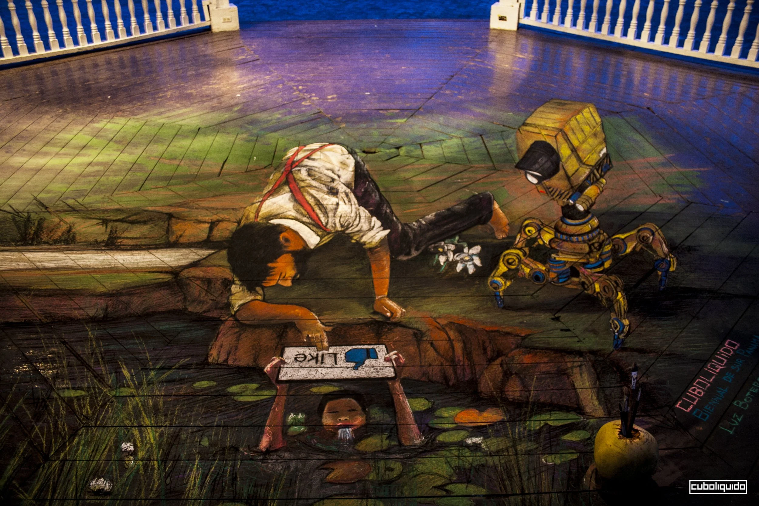 Cuboliquido is a versatile artist and one of the pioneers of 3D Street Art. With over three decades of experience in communication and visual art, he transforms urban spaces into installations, scenographies, and three-dimensional canvases through the use of anamorphic perspective.